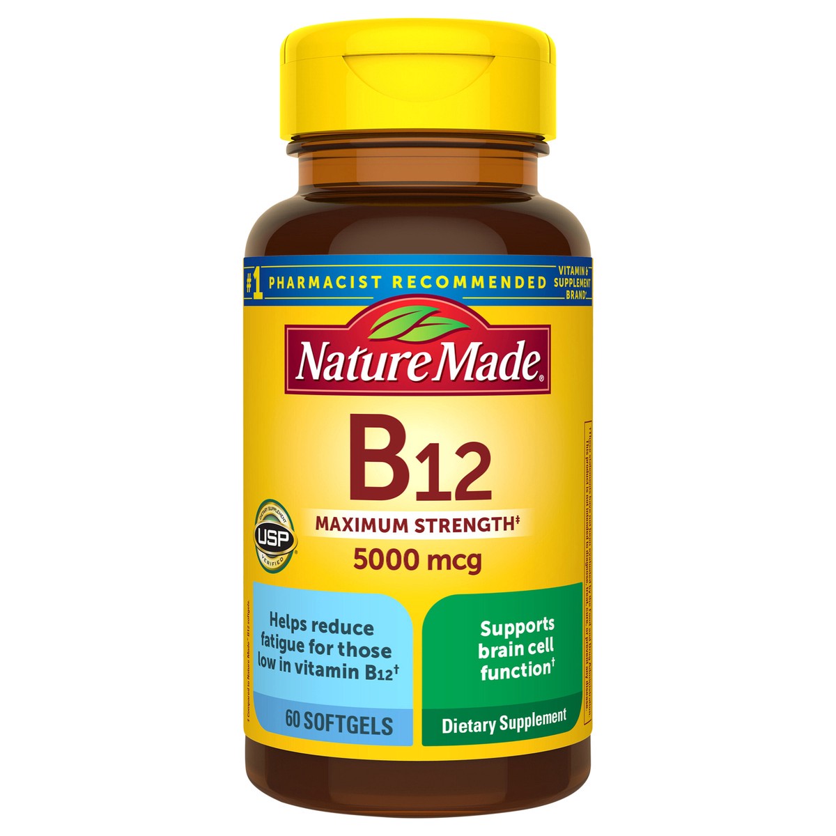 Nature Made Maximum Strength Vitamin B12 provides 5000 mcg of Vitamin B12, which helps break down food into energy that your body can use all day long. This gluten free B12 supplement has no artificia…