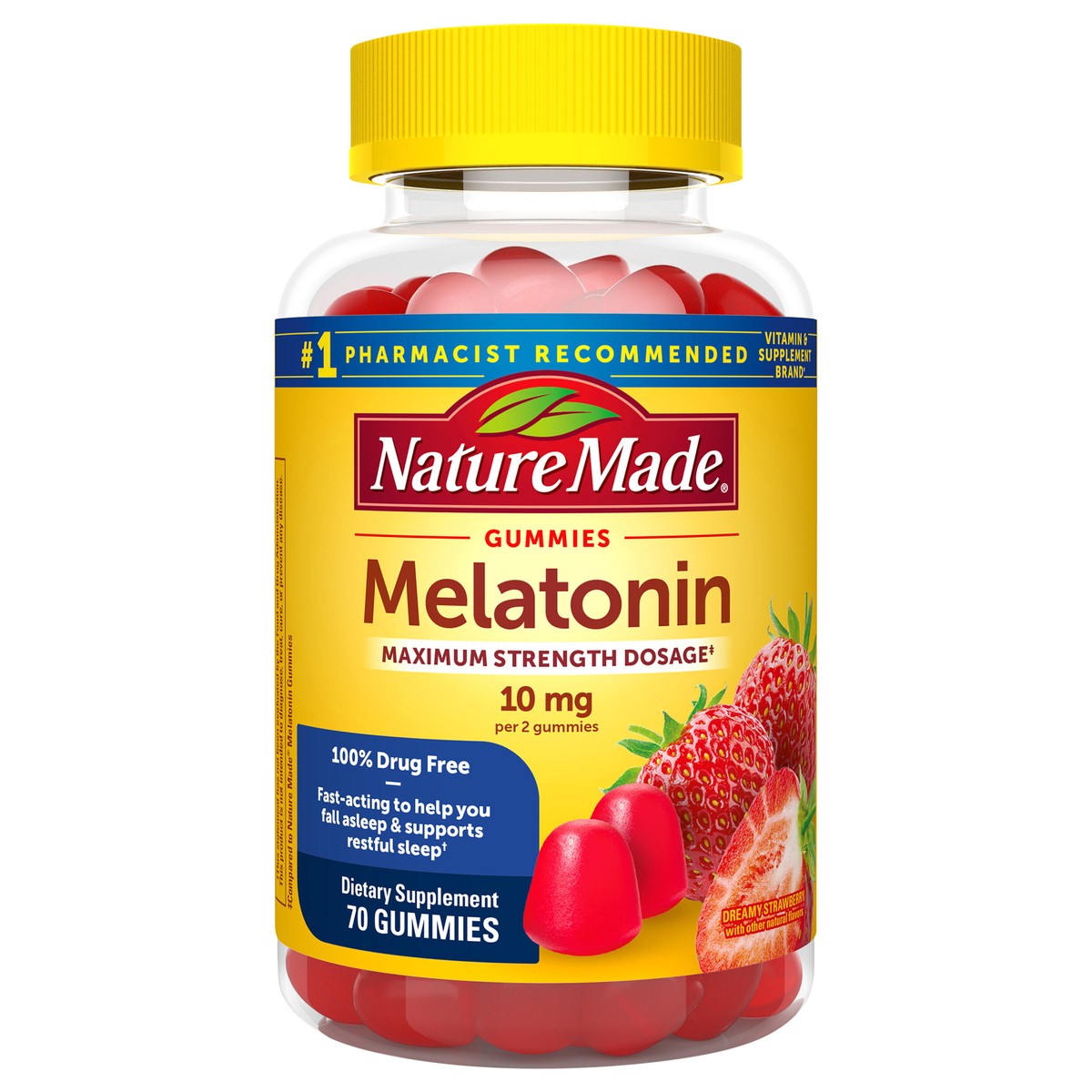Melatonin Gummies 10 mg per serving is a Nature Made Maximum Strength Dosage(1) Melatonin supplement formulated to help you fall asleep faster and support restful sleep. Nature Made's Melatonin 10 mg …
