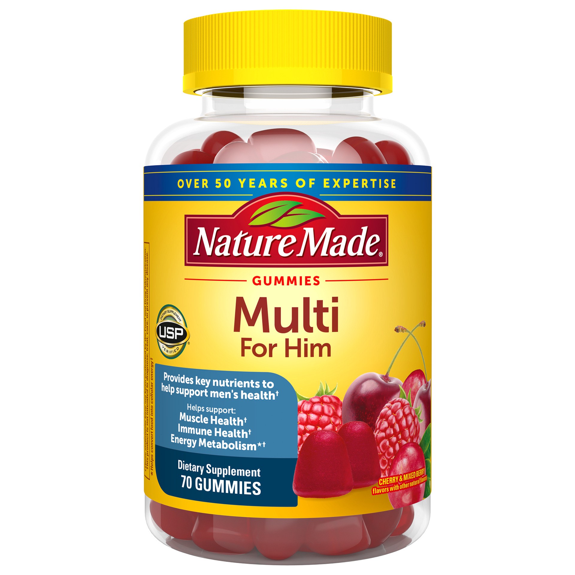 Nature Made Multi for Him Gummies are men's multivitamins that provide key nutrients to support men's health in delicious cherry and mixed berry gummies with other natural flavors to help fill potenti…