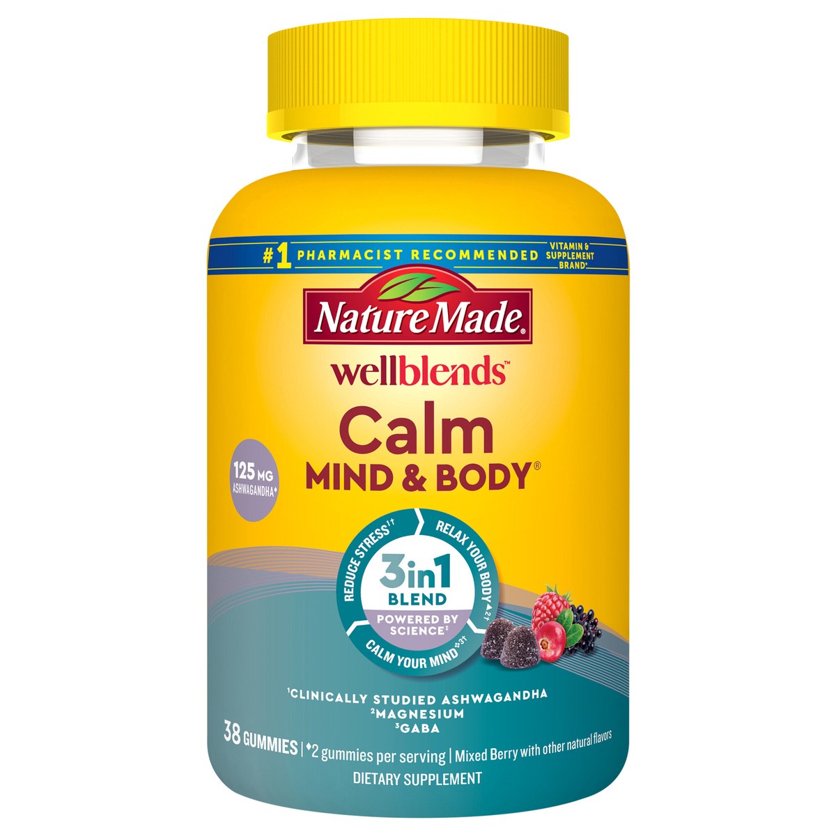 Nature Made Wellblends Calm Mind & Body Gummies provide 3 benefits in 1 blend of GABA, Ashwagandha and Magnesium to help reduce stress and relax the mind and body. Two tasty gummies provide GABA 100mg…