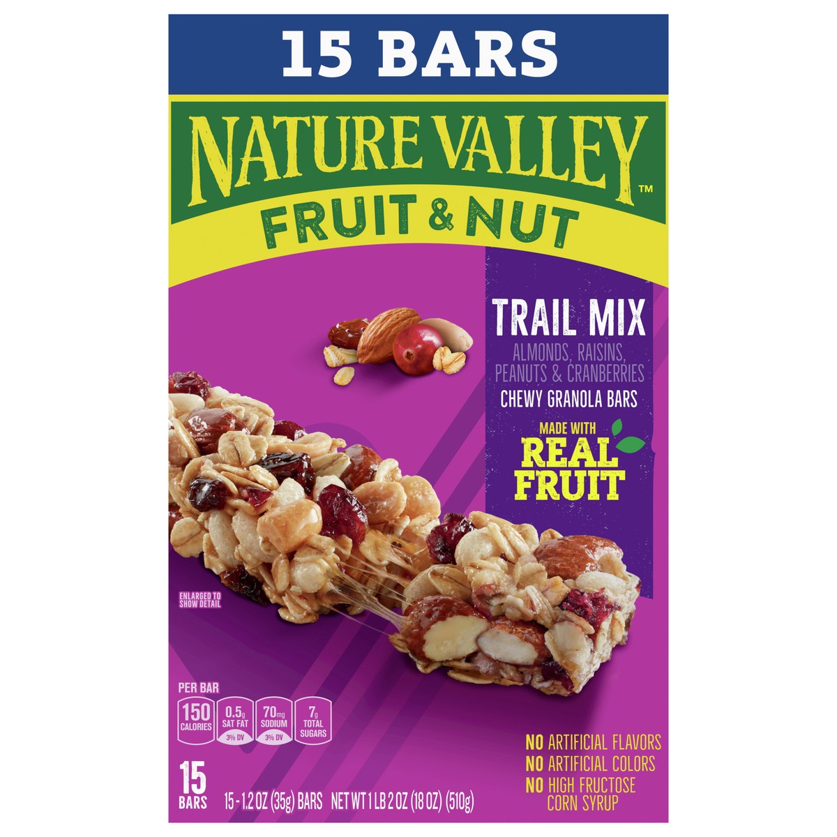 No artificial colors. No high fructose corn syrup. Trail Mix: Almonds, raisins, peanuts & cranberries. 15 bars. Box Tops for Education: Scan your receipt earn cash for schools.