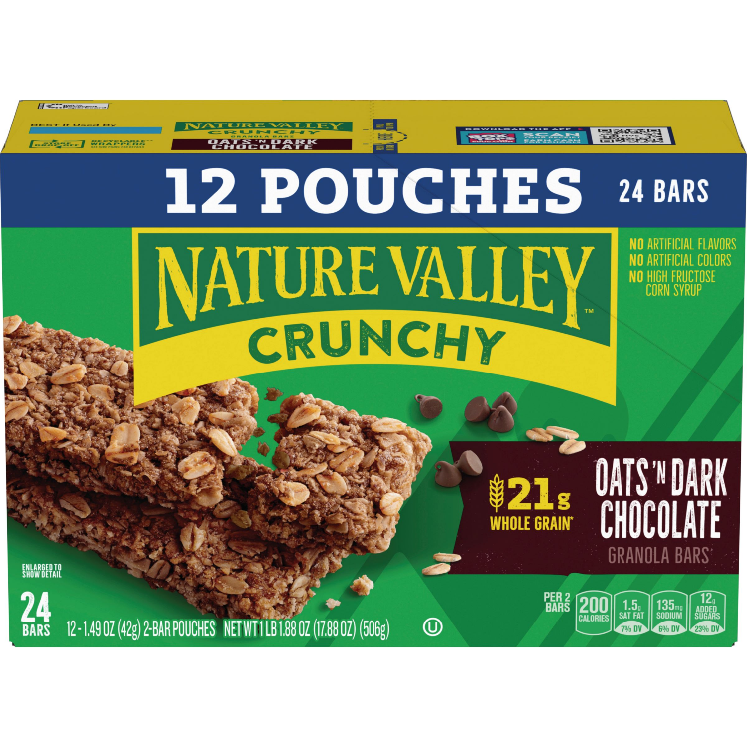 Nature Valley Oats 'n Dark Chocolate Crunchy Granola Bars are tasty snacks made with dark chocolate pieces, whole-grain oats and a touch of honey. There are no artificial flavors, colors or high fruct…
