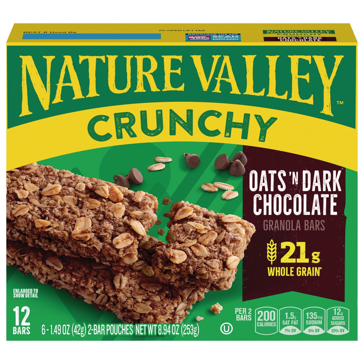 The Original Crunch. Nature Valley Crunchy Oats 'n Dark Chocolate Granola Bars are a tasty snack made with whole-grain oats and dark chocolate pieces. A portable snack that's perfect for the pantry, l…