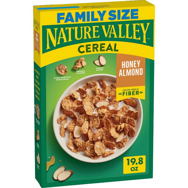 - CONTAINS: One cardboard box of crunchy Nature Valley Honey Almond Cereal, Family Size, 19.8 oz; Perfect for instant snacking, or a part of breakfast and meals