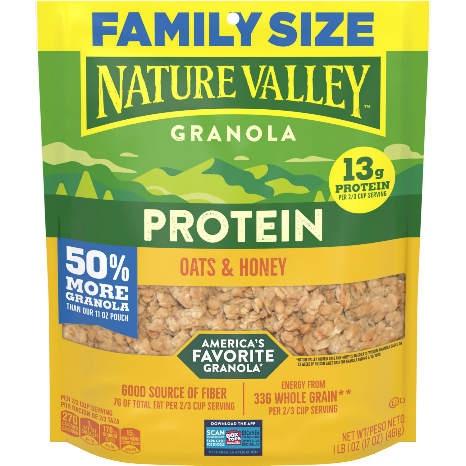 Nature Valley Protein Granola, Oats and Honey Granola, Resealable Snack Pouch, Family Size, 17 oz