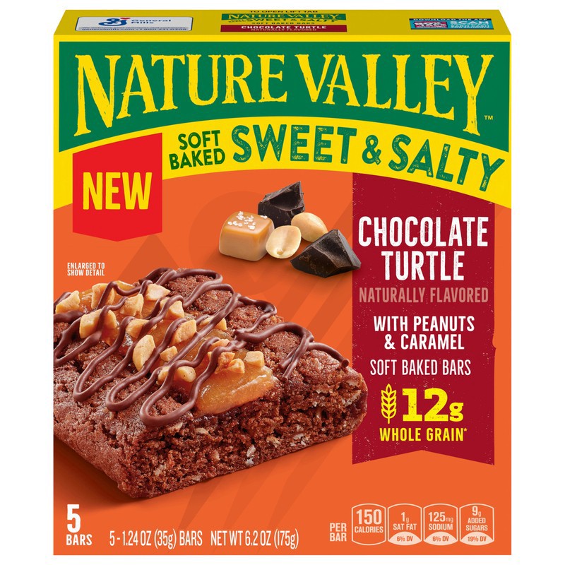 slide 3 of 5, Nature Valley Soft Baked Sweet and Salty Bars, Chocolate Turtle, Made with Whole Grain, 5 Bars, 6.2 oz, 5 ct