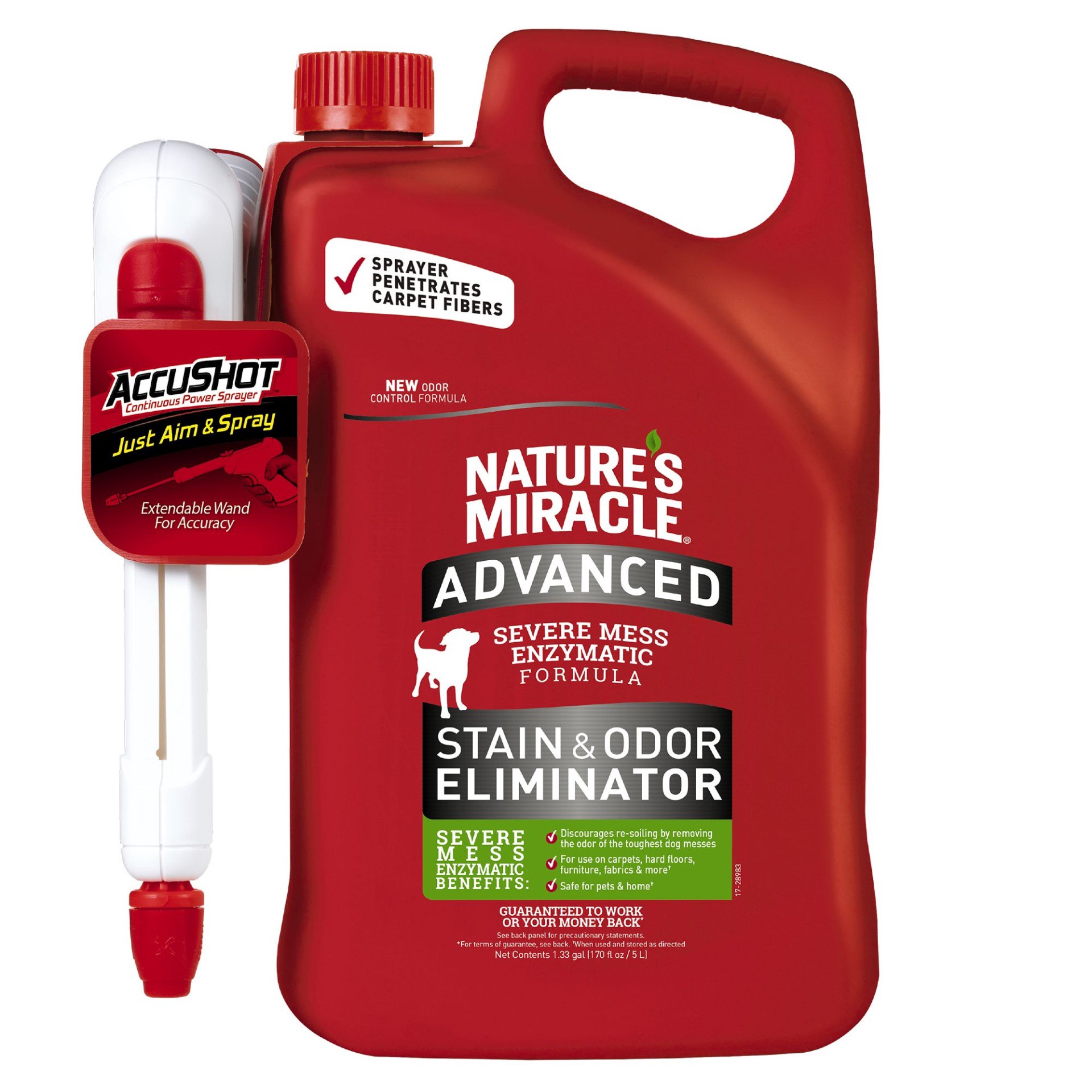 Nature's Miracle AccuShot Advanced Stain and Odor Remover works to discourage re-soiling by removing the odor of pet messes. The bacteria-based formula produces enzymes when it comes in contact with o…