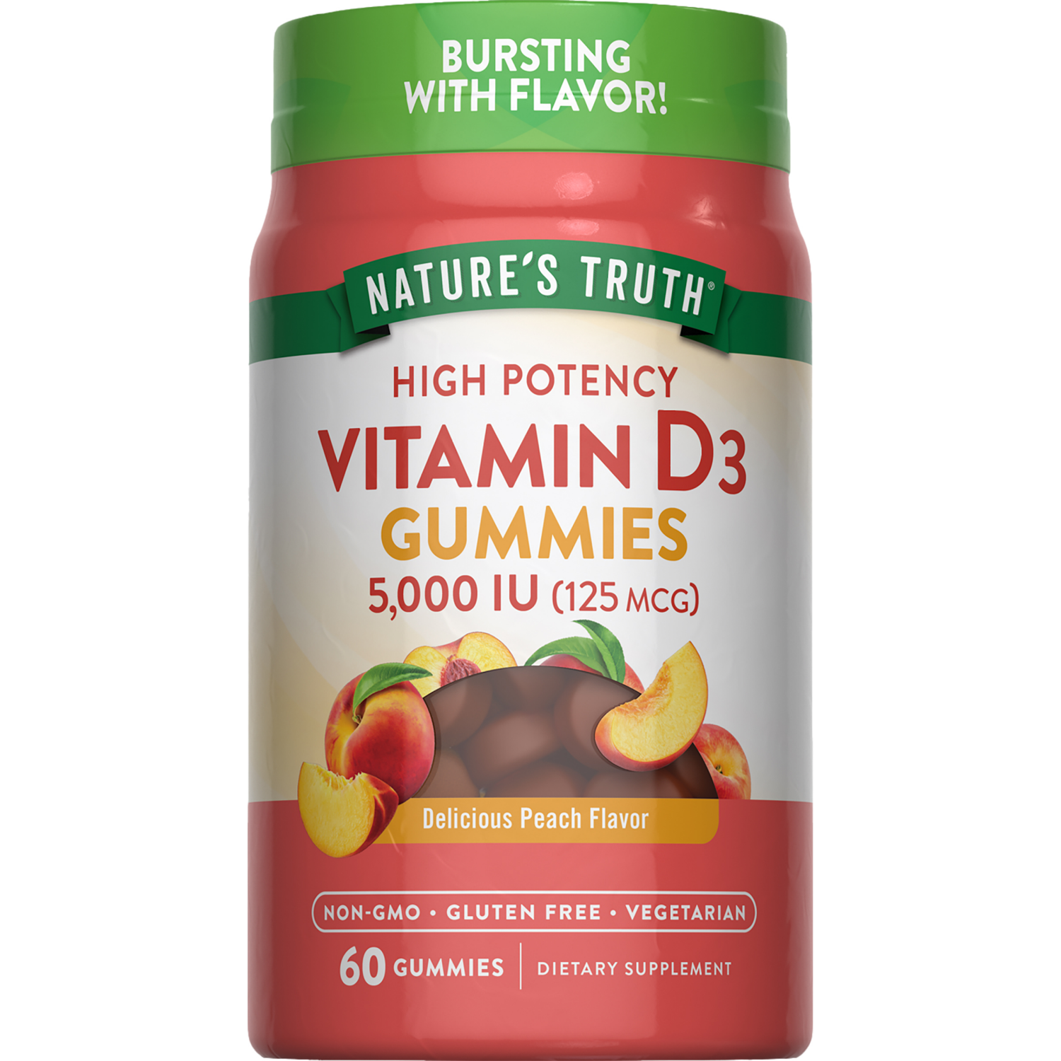 Dietary Supplement. 5,000 IU (125 MCG). Gluten free. No gluten, wheat, yeast, milk, lactose, soy, artificial flavor, artificial sweetener. Vegetarian formula. Non-GMO. Our non-GMO pledge. Visit our we…