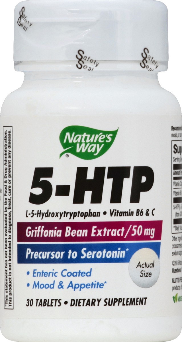 Dietary Supplement. L-5-hydroxytryptophan. Vitamin B6 & C. Griffonia bean extract/50 mg. Precursor to serotonin. Mood & appetite. Questions? 1-800-9Nature/naturesway.com. Gluten free. No sugar, salt, …