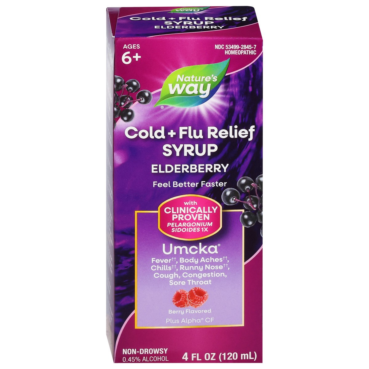HSA/FSA Eligible. -- NATURES WAY. Homeopathic Umcka Elderberry. Intensive Cold+Flu. Aches/Pains Fever Congestion Cough Runny Nose Sore Throat. Multi-Action RELIEF. Pelargonium sidoides 1X plus Elderbe…