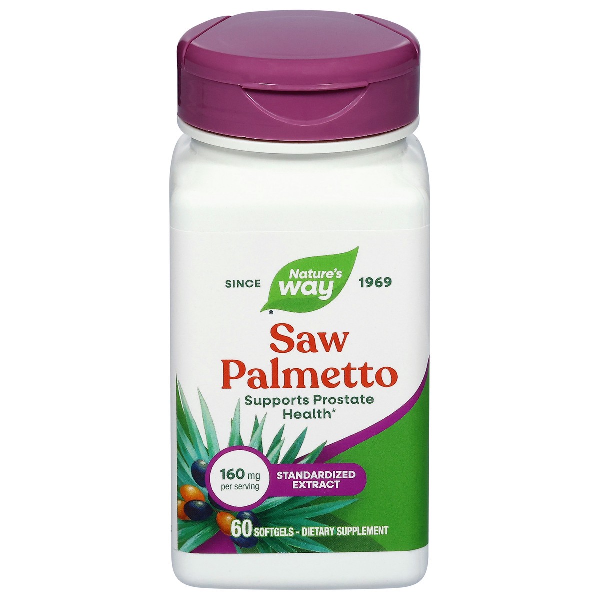 Dietary Supplement. Premium extract. 85-95% fatty acids. Questions? 1-800-9nature/naturesway.com. Supports prostate health. Our standardized Saw Palmetto is carefully tested and produced to superior q…