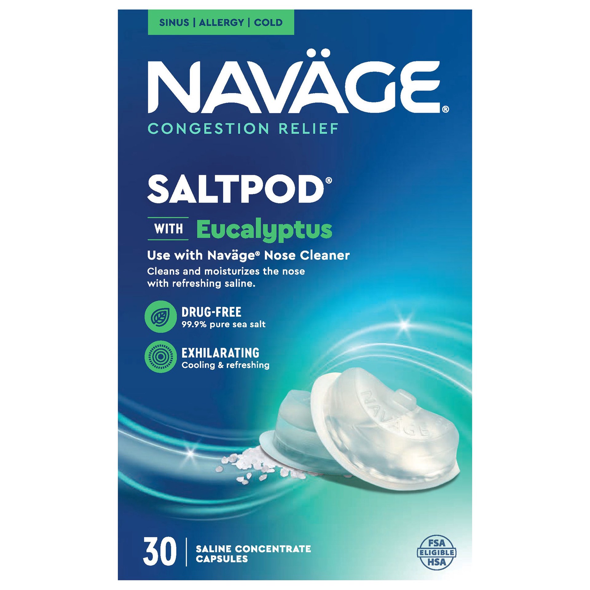 30 saline concentrate capsules. Nature's decongestant! Eucalyptus cools, refreshes, and moisturizes your sinuses with an exhilarating new aromatic sensation! FSA eligible. Breathe better now. Nasal ca…
