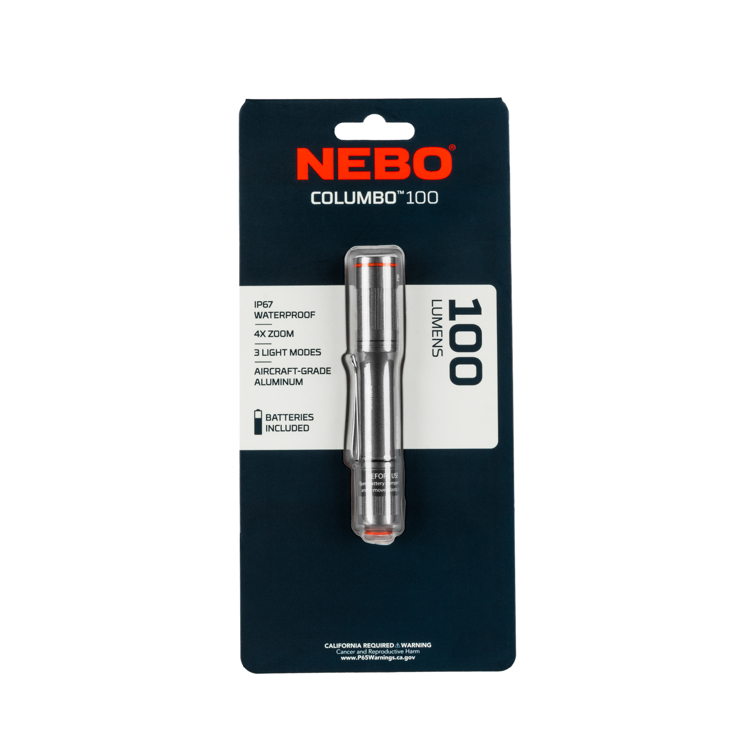 The COLUMBO 100 features a 100 lumen LED, 3 light modes, 4x adjustable zoom, Easy Touch Technology, strong steel clip, and a waterproof (IP67) anodized aircraft-grade aluminum body. The included AAA a…