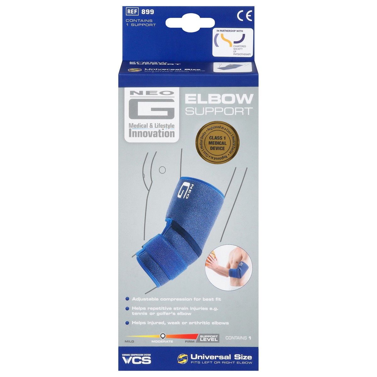 Ref. 899. Contains 1 support. Medical & lifestyle innovation. VCS: Variable Compression System. Fits left or right elbow. Adjustable sizing. Features: Bound edges for comfort and durability. Heat ther…