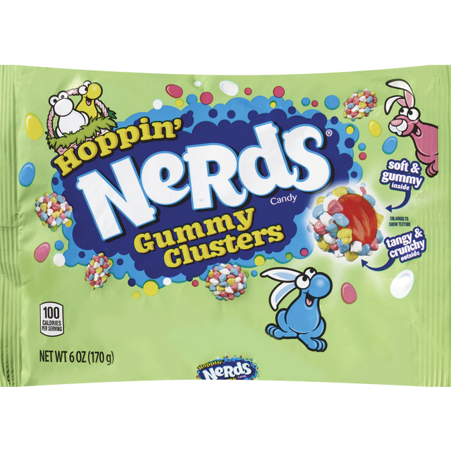 NERDS Hoppin' Gummy Clusters is made of crunchy mini NERDS around a sweet gummy center. Take your taste buds on a spring adventure with a twist on the gummy, crunchy rainbow candy. Make every Easter c…