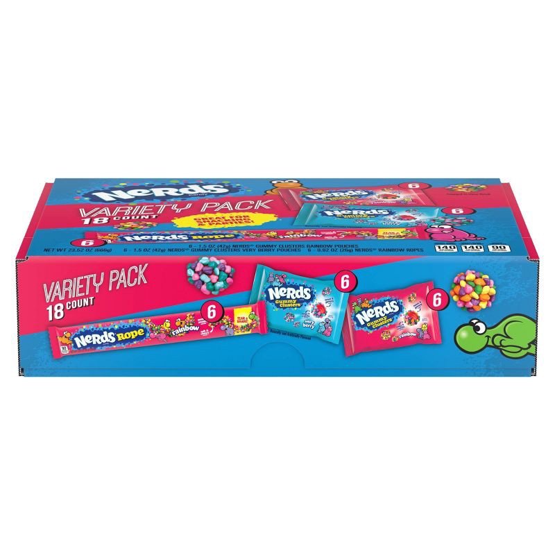 - GREAT FOR SHARING: This NERDS Variety Pack has something for everyone. With 18 individually wrapped candy packs, this shareable mix has you covered on travel candy, road trip must haves, and even your movie theater candy needs