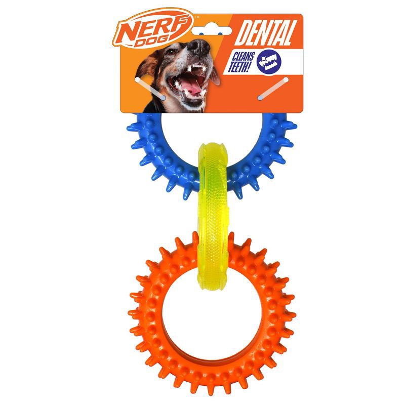 The Nerf Dog Spike 3-Ring Tug is perfect for a game of tug of war! Its made of durable TPR to handle lots of chewing and tugging. And while playing, the dental spikes help to keep your dog's teeth hea…