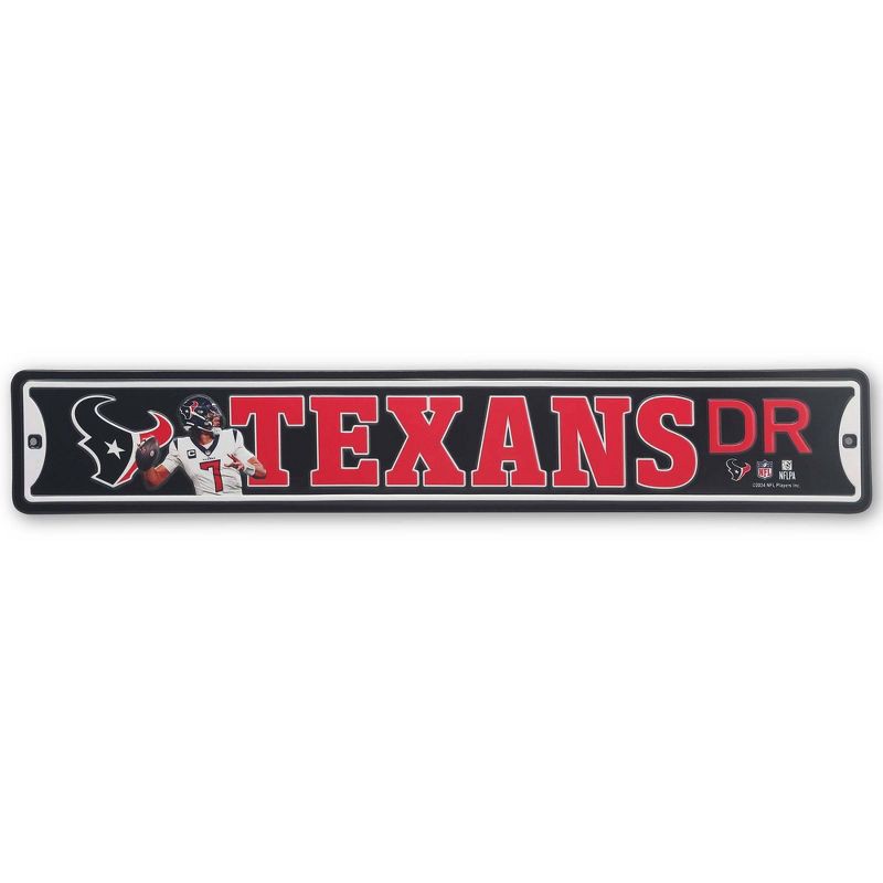- Fun Vintage Sign: This exciting wall art is designed to look like a street sign, but it features the Texans' signature deep steel blue, battle red, and liberty white color scheme and logo. Emblazoned with the text, “Texans Dr.,” this piece offers a striking expression of your passion for the Houston Texans.
