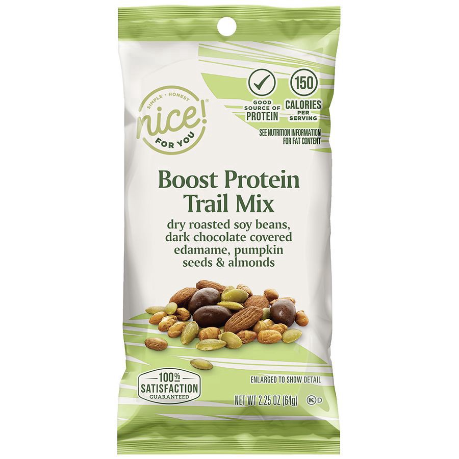 Dry roasted soybeans, Dark Chocolate Edamame, Pumpkin Seeds, and Almonds. Made in Product of USA, Canada, and China