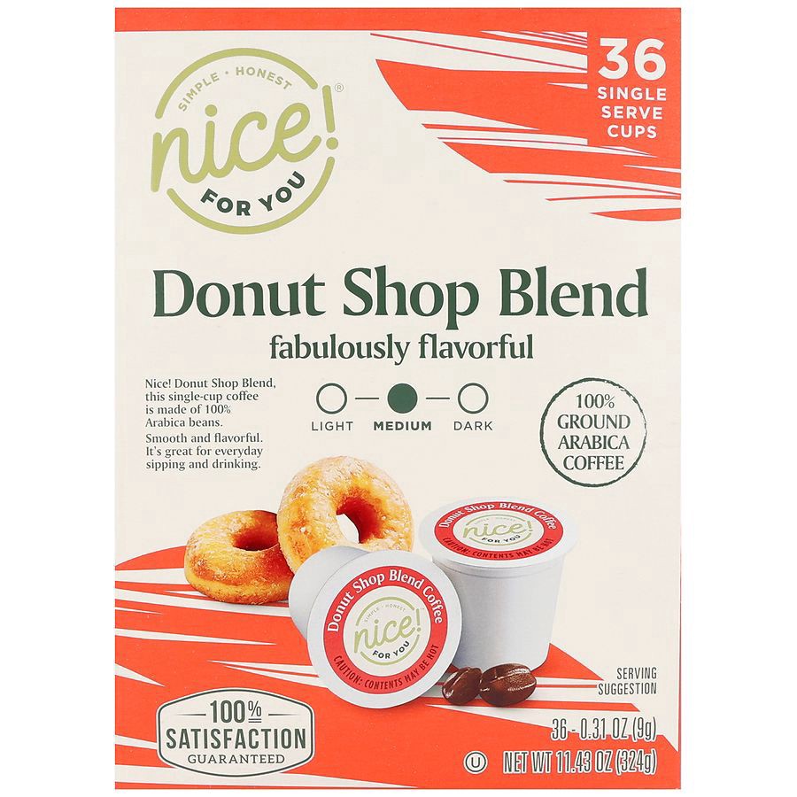 Fabulously flavorful Medium roast 100% ground Arabica coffee Nice! Donut Shop Blend, this single-cup coffee is made of 100% Arabica beans. Smooth and flavorful. It's great for everyday sipping and driā¦