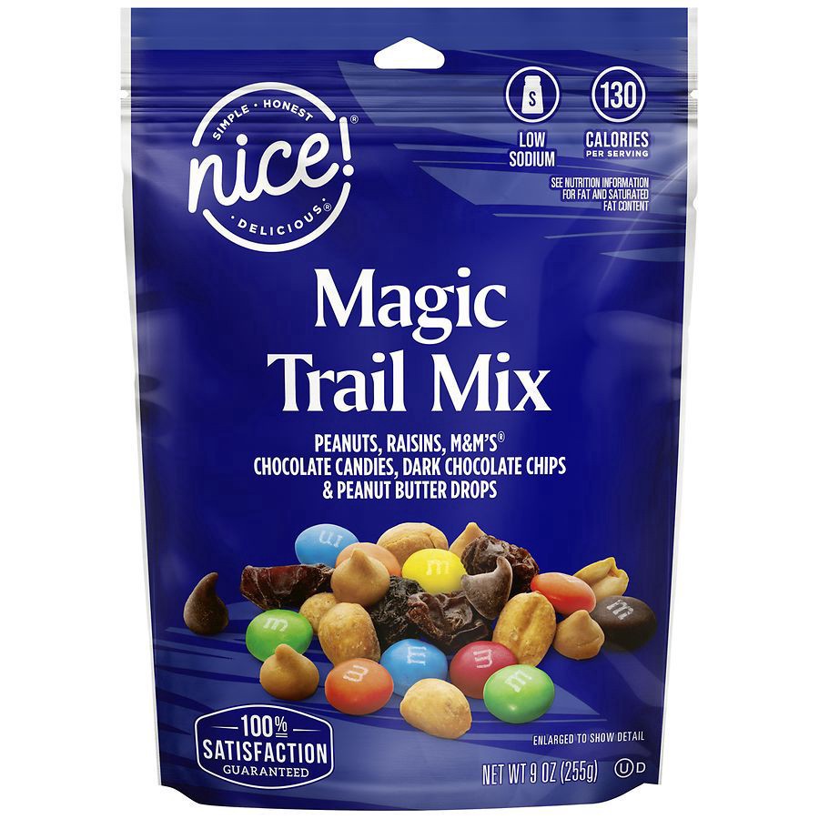 Nice! Magic Mix – 9 oz. A little sweet. A little salty. Nice! Magic Trail Mix is a classic mix whether you’re on the trail or at your desk. · Made with peanuts, raisins, M&M’sÒ Chocolate Candies, choc…