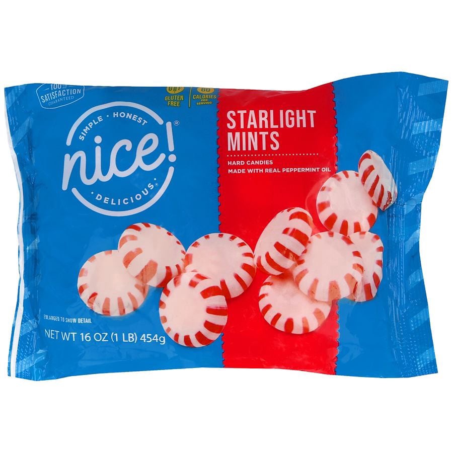 Made with real peppermint oil. 60 calories per serving. Gluten free. Simple. Honest. Delicious. New improved. A goto classic after dinner or before a meeting. Nice Starlight Mints provide a cool burs…