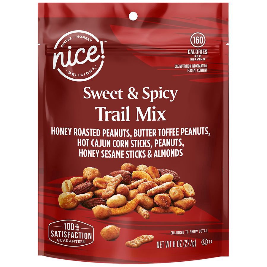 Trail Mix blend of Honey Roasted Peanuts, Butter Toffee Peanuts, Hot Cajun Corn Sticks, Peanuts, Honey Sesame Sticks Almonds. Made in USA