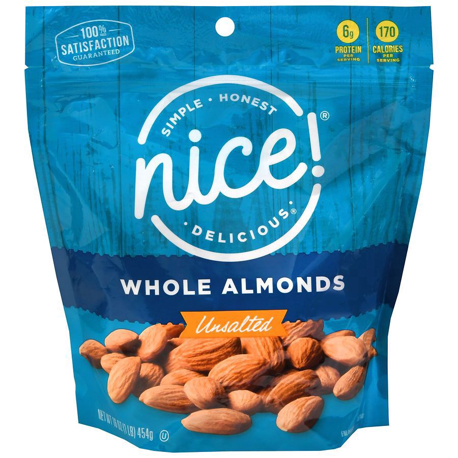 Nice Whole Almonds are the perfect wholesome snack any time of day. Enjoy in between meals, or add to oatmeal, granola or pasta dishes for added fiber. 6g Protein Per Serving 170 Calories Per Serving …