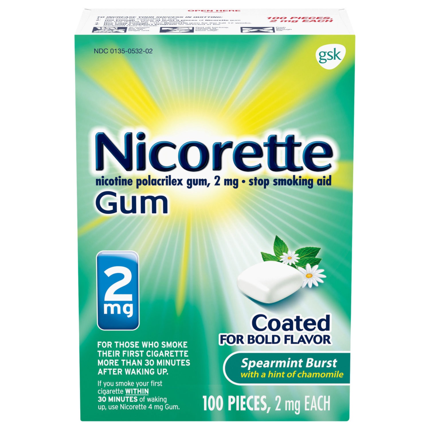 In Each Chewing Piece: Active Ingredients: Nicotine Polacrilex (Equal to 2 mg Nicotine), Stop Smoking Aid. In Each Chewing Piece: Inactive Ingredients: Acacia, Acesulfame Potassium, Carnauba Wax, Edib…