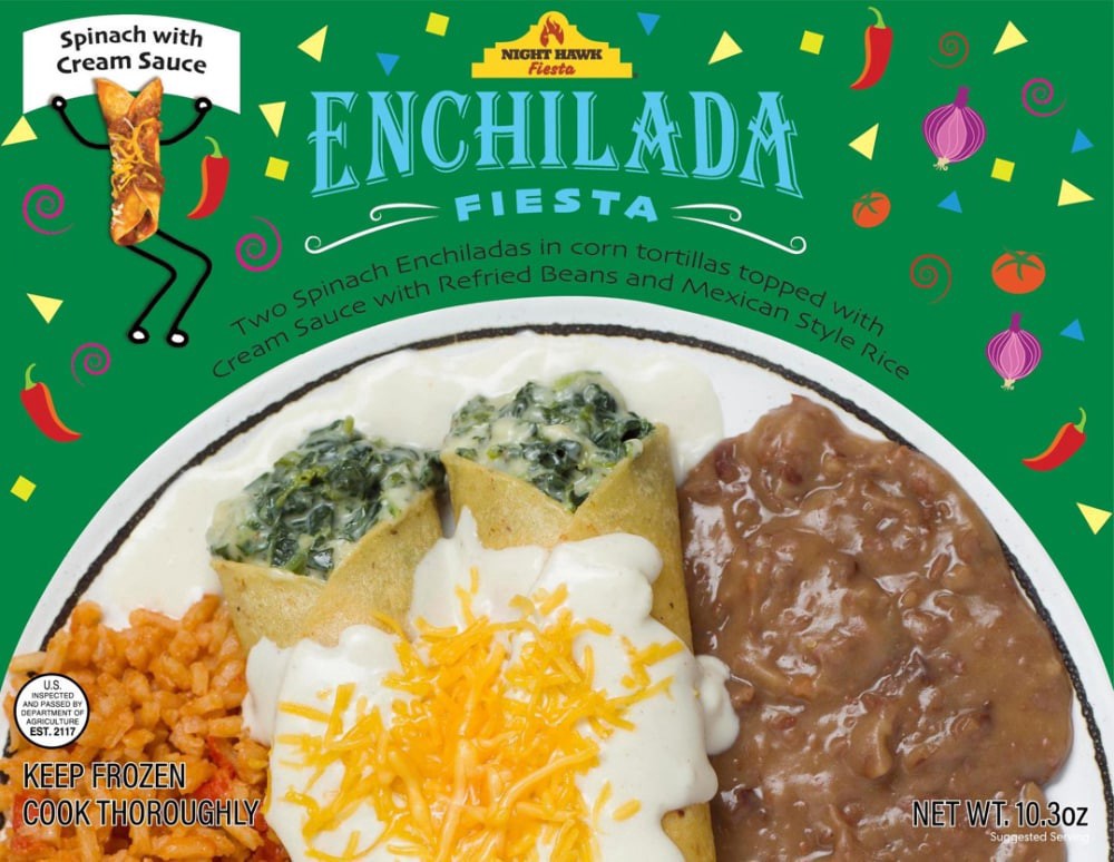 Spinach Enchiladas with Cream Sauce. Savor two spinach enchiladas in corn tortillas, topped with creamy sauce and cheddar cheese. Served with refried beans and Mexican-style rice, it's a vegetarian de…
