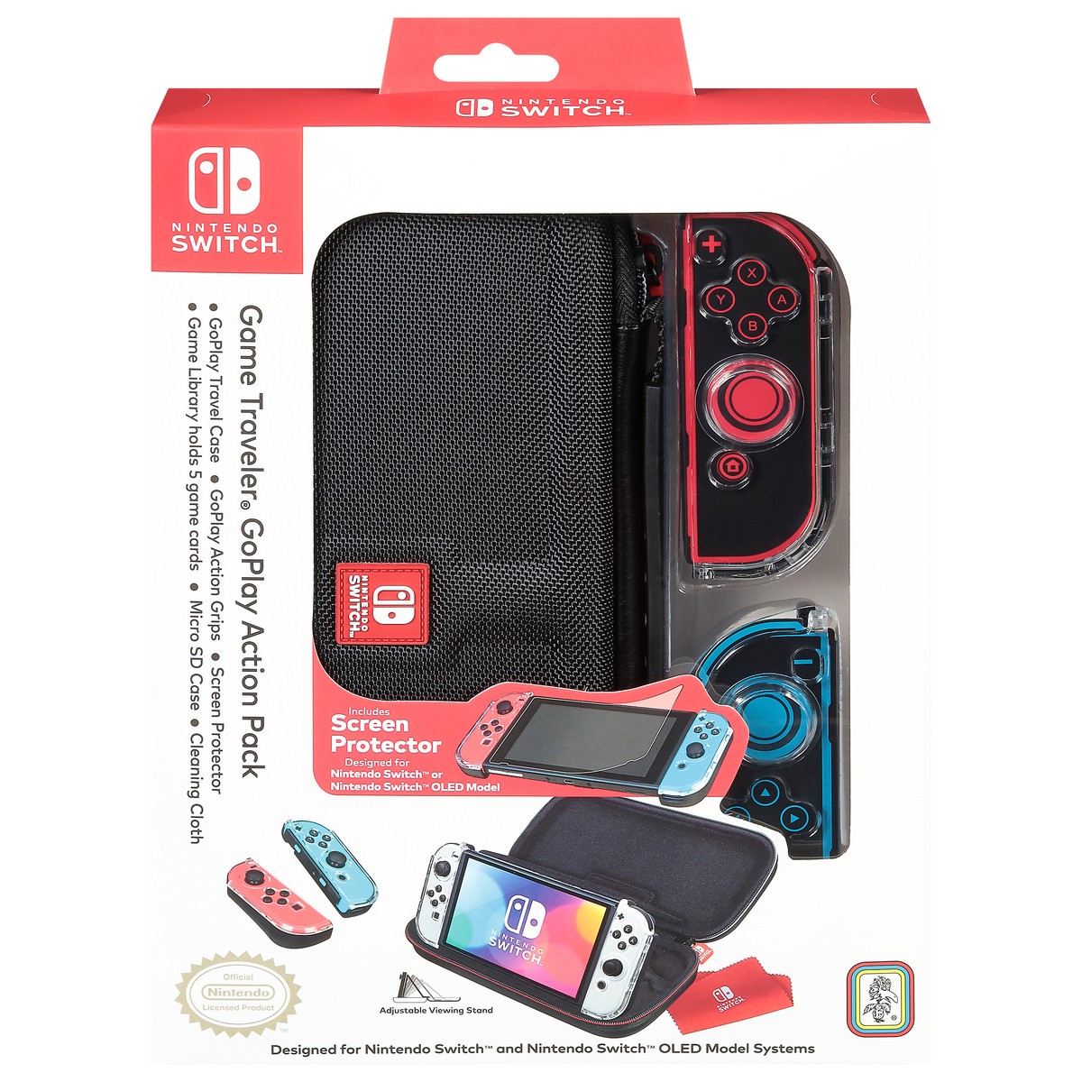 Goplay travel case. Goplay action grips. Screen protector. Game library holds 5 game cards. Micro SD case. Cleaning cloth. Adjustable viewing stand. Designed for Nintendo switch and Nintendo switch Ol…