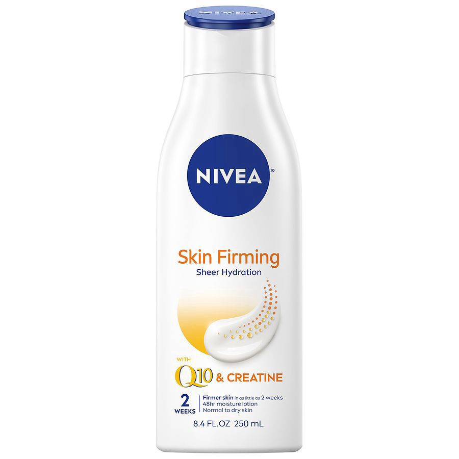 One 8.4 fluid ounce bottle of NIVEA Skin Firming Sheer Hydration Body Lotion with Q10 and Creatine This hydrating body lotion delivers all-day moisture while also firming the skin in as little as two …