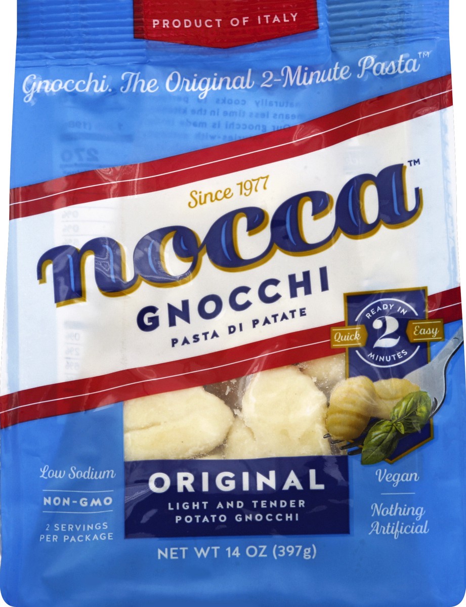 Light and tender potato gnocchi. Gnocchi. The original 2-minute pasta. Quick ready in 2 minutes easy. Low sodium. Non GMO. 2 serving per package. Vegan. Nothing artificial. Ready, set, dinner! Gnocchi…
