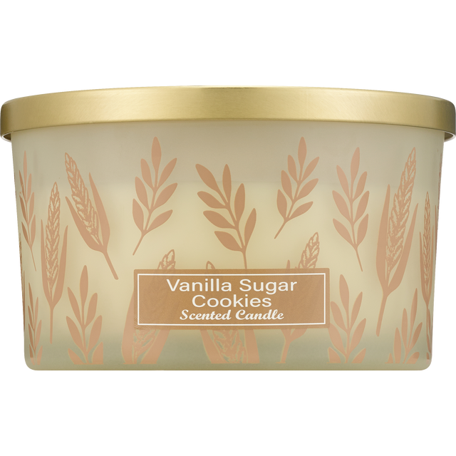 Frost tint glass printed, scented wax, metal lid 14OZ. CREAM VANILLA SUGAR COOKIE REED GRASS CANDLE PLEASE SEE PRODUCT LABEL FOR FULL INFORMATION USE AS DIRECTED
