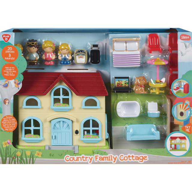 Open up the cottage to reveal the daily life of a happy family! Soft vinyl figures including 5 family members with puppy in a warm sweet house!