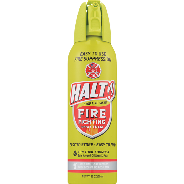 Halt puts out small fires fast! Safe around pets and kids with it's non-toxic formula Easy to store Easy to find