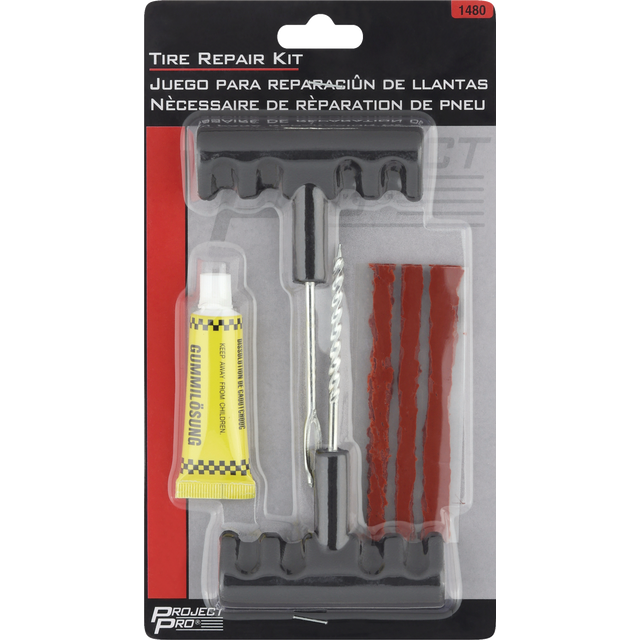 Tire repair kit includes 3 plugs, glue, reamer and insertions tool.