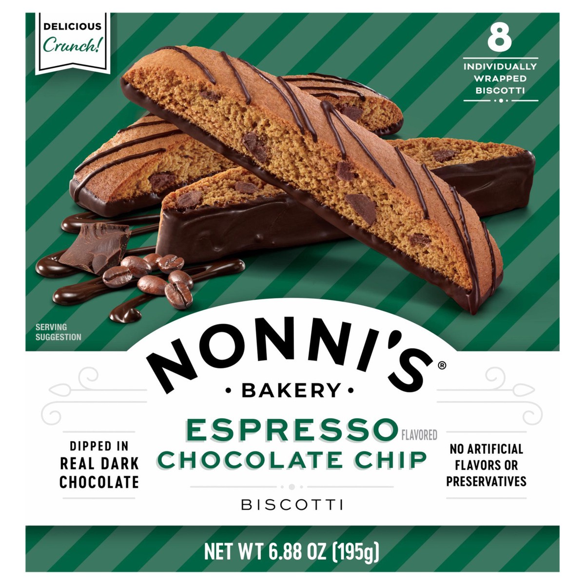 An espresso-flavored biscotti dipped and drizzled in rich dark chocolate and filled with chocolate chips. A coffee and chocolate lover''s dream. Nonni's Biscotti are made with real, wholesome ingredie…