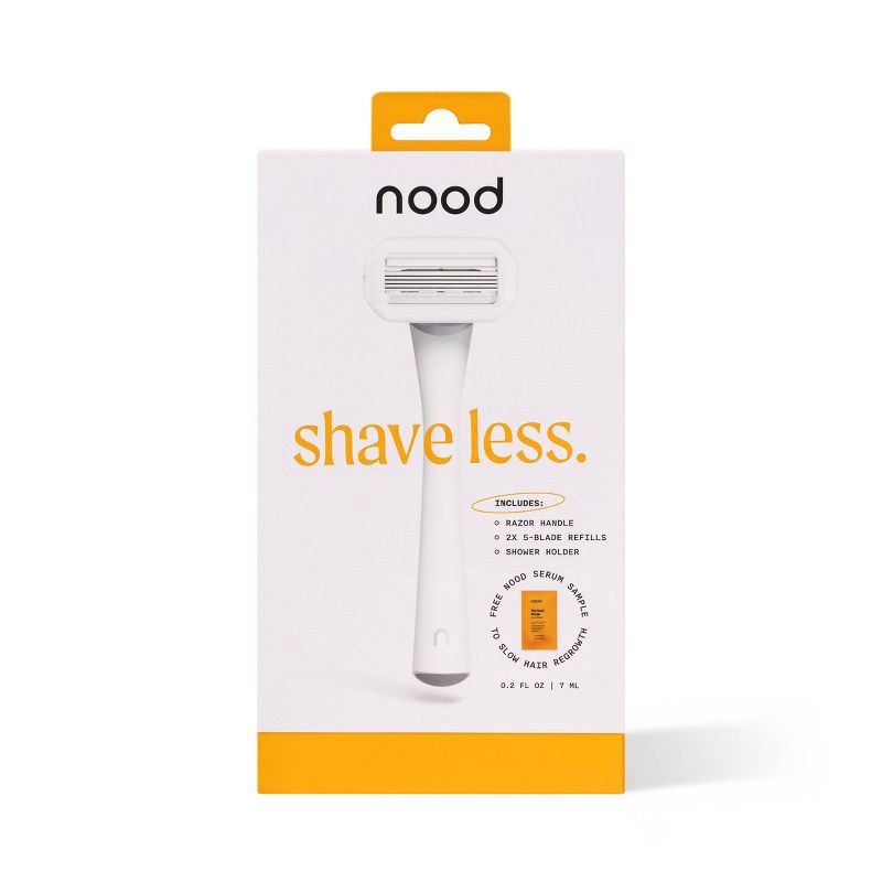 - Includes razor handle, 2 blade refills, shower holder, and The Nood Serum sample