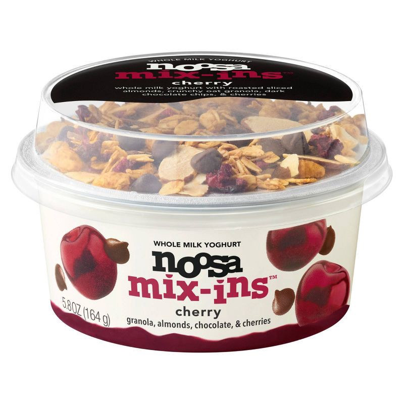 - NOOSA CHERRY MIX-INS YOGHURT: noosa yoghurt 'full on' whole milk yogurt atop real black cherry puree with dark chocolate chips, honey oat granola, sliced roasted almonds, & dried cherries.
