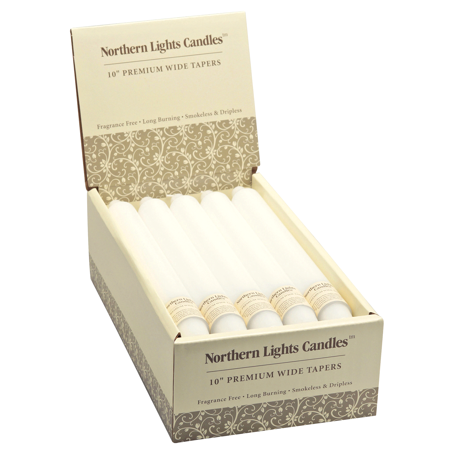 Our distinctive 10 taper candles are 1 inch wide. They are smokeless and dripless and come with a tapered bottom to fit any standard sized taper holder.