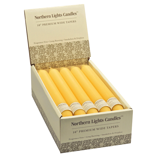 Our distinctive 10 taper candles are 1 inch wide. They are smokeless and dripless and come with a tapered bottom to fit any standard sized taper holder.