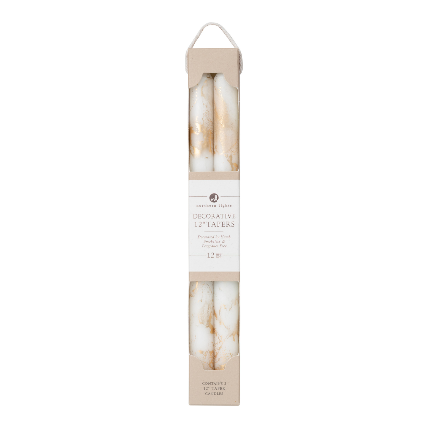 2 pack of 12" Premium European Tapers with a Gold Foil Decoration in a Kraft Box