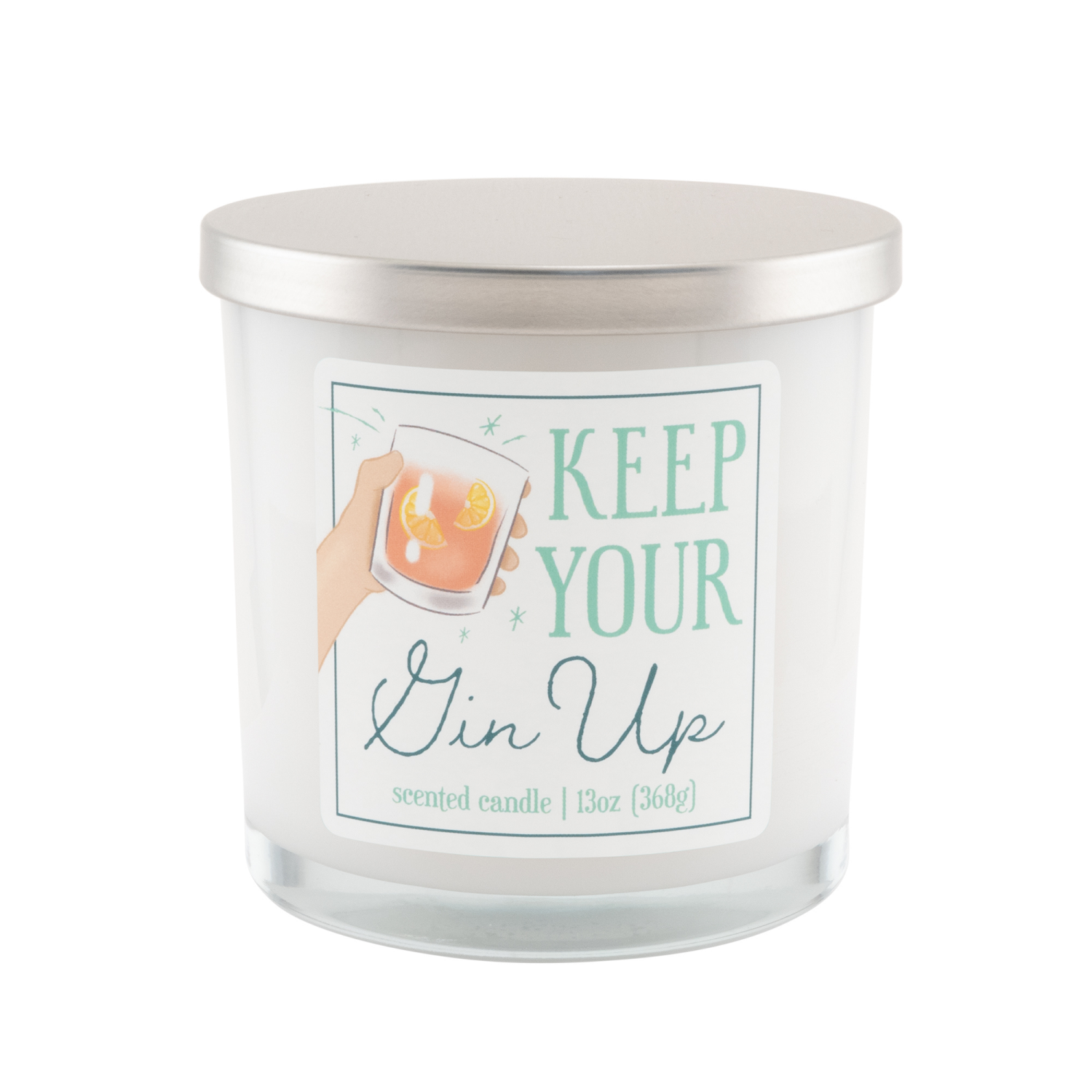 Cocktail inspired Keep Your Gin Up Sentiment candle.