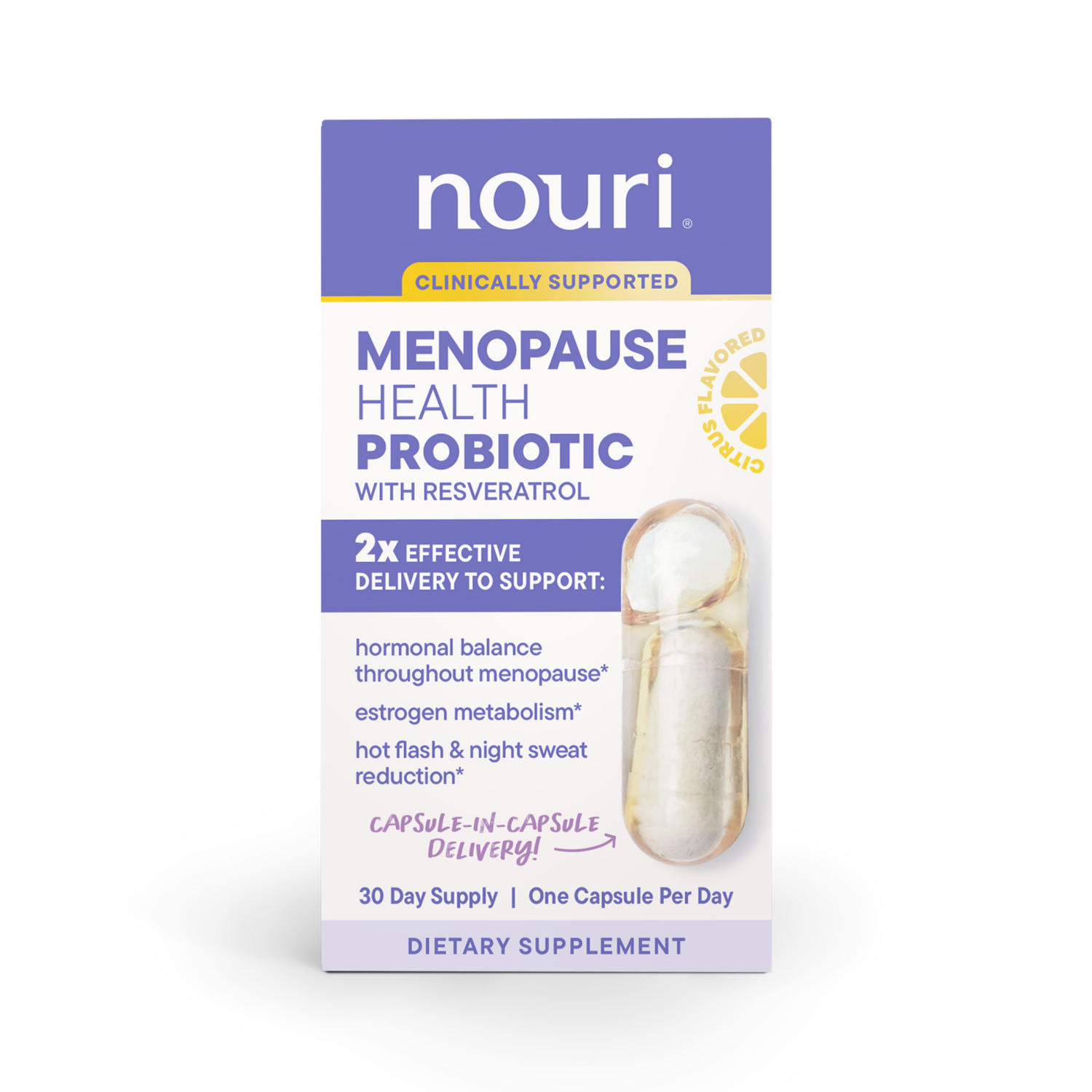 slide 1 of 2, Nouri Menopause Health Daily Probiotic Capsules with Resveratrol and Plant-Based Omega Oil, 30 ct