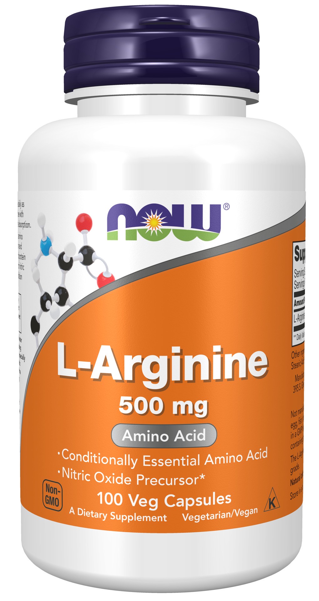 NOW L-Arginine comes in 500 mg capsules and is non-GMO. Arginine is a conditionally essential basic amino acid involved primarily in urea metabolism and excretion, as well as in DNA synthesis and prot…