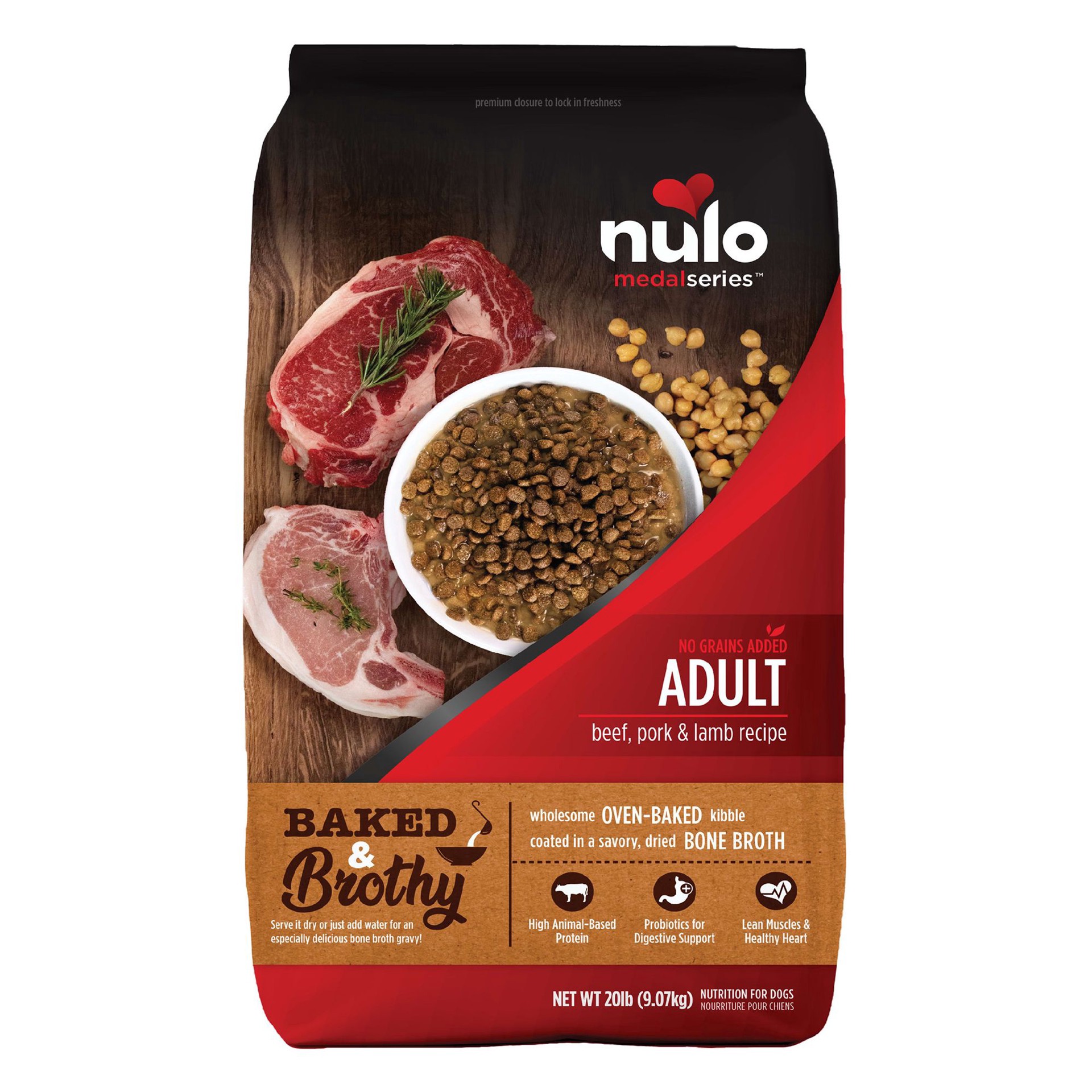 Nulo MedalSeries Baked & Brothy is protein-rich kibble for adult dogs made with beef and pork then coated in savory bone broth - all gently oven-baked to preserve flavor and nutrients in a dry, conven…