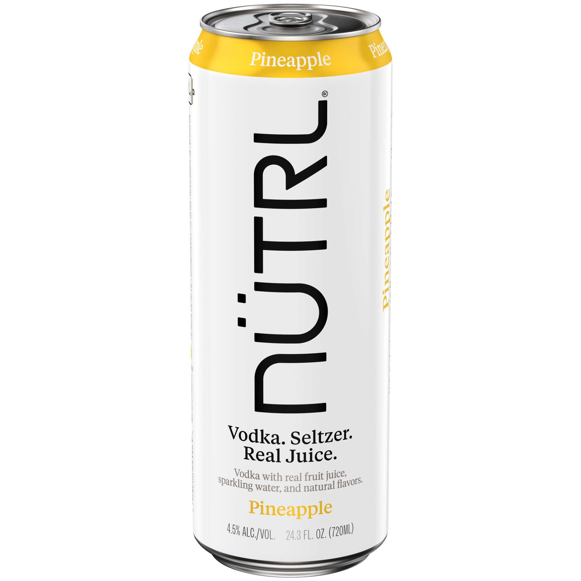 Nutrl Pineapple Vodka, 720 ml 1 Can, Vodka Hard Seltzer, contains 4.5% alcohol by volume. Real juice. Enjoy responsibly. No added sugar, Gluten Free. This stuff tastes good. Like really good. Like, th…