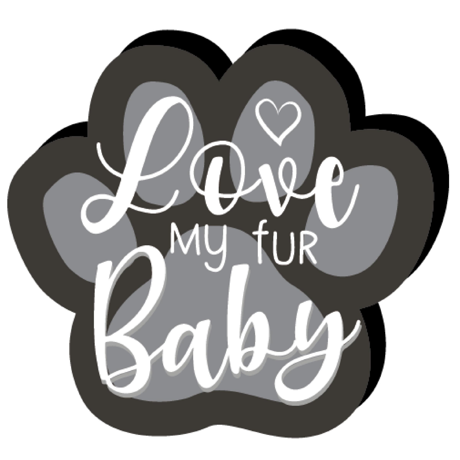 Paw print shaped chunky clever caption with sentiment and raised element. Sentiment reads" love my fur baby."