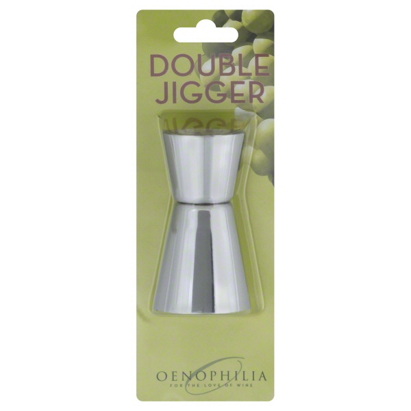 For when a single jigger is not enough. Measures a jigger and a pony shot. Stainless steel. For the love of wine. www.oenophilia.com. Made in China.